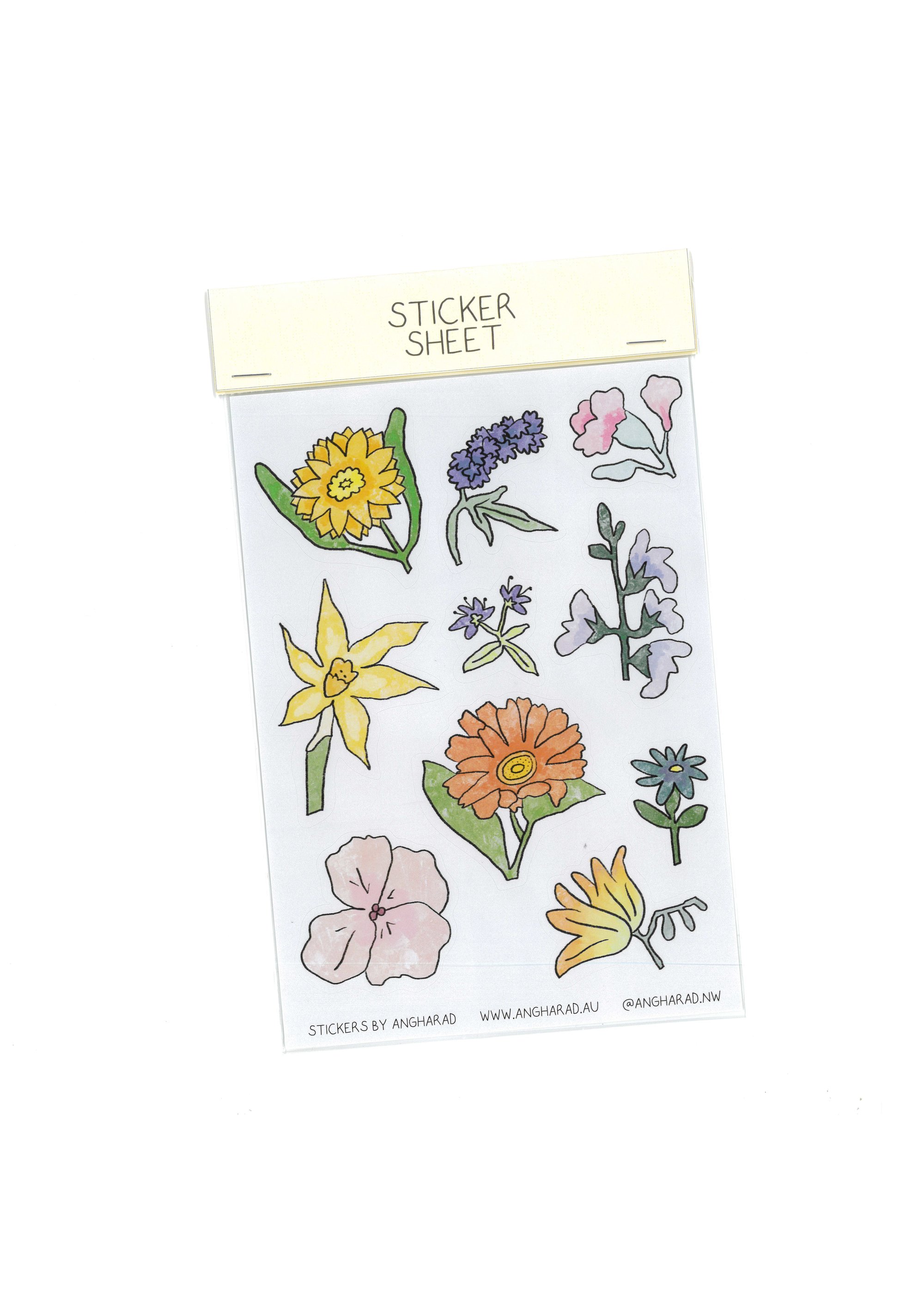 The 'Flower Collector' sticker sheet is filled with flowers collected on neighbourhood walks around Melbourne. Jonquills, freesias, lavendar, sweet peas and calendula fill the sticker sheet.